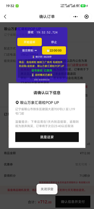 - 📍 提前卡位:只需手动进入**「提交订单」**页面,点击开始挂机即可。